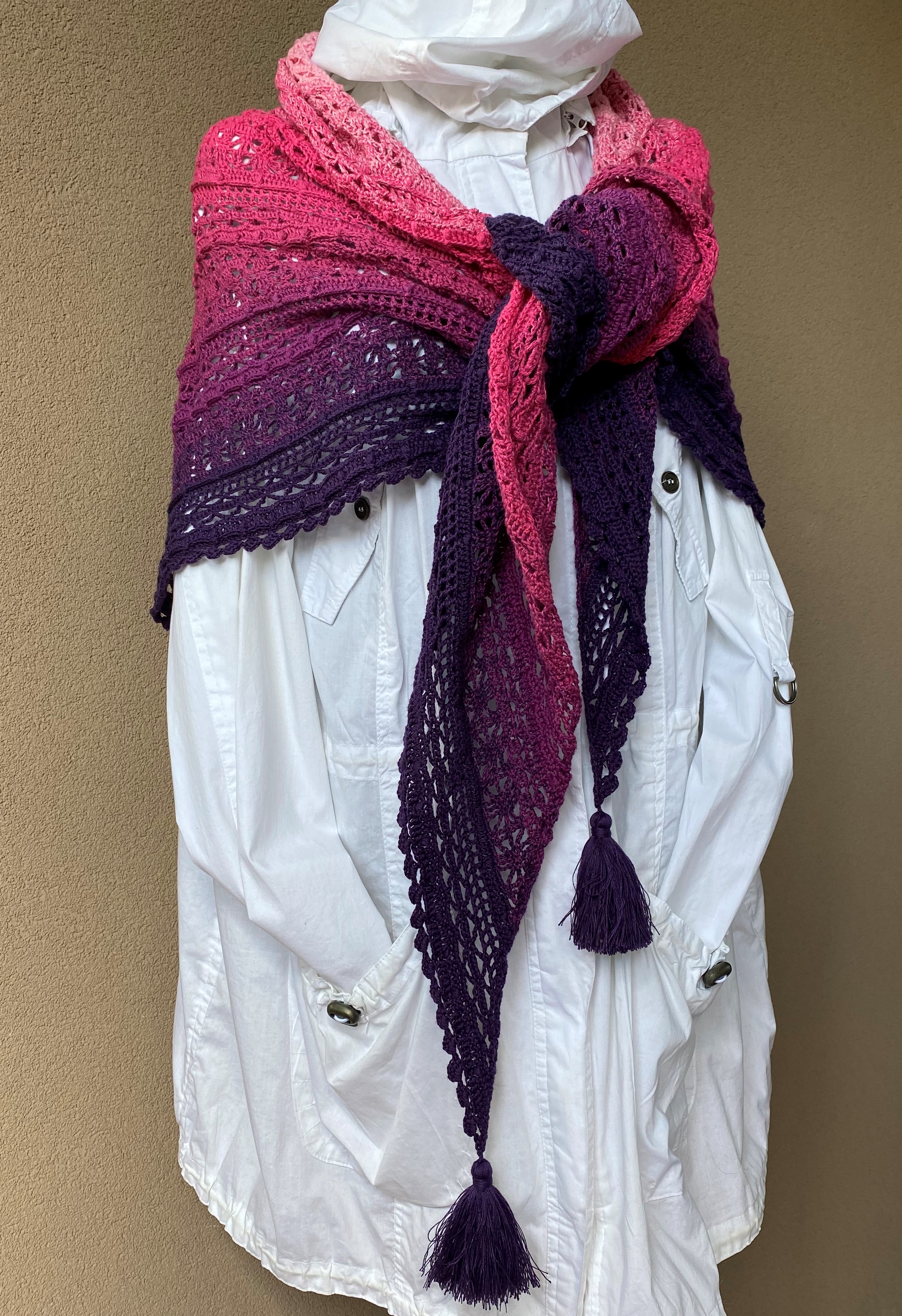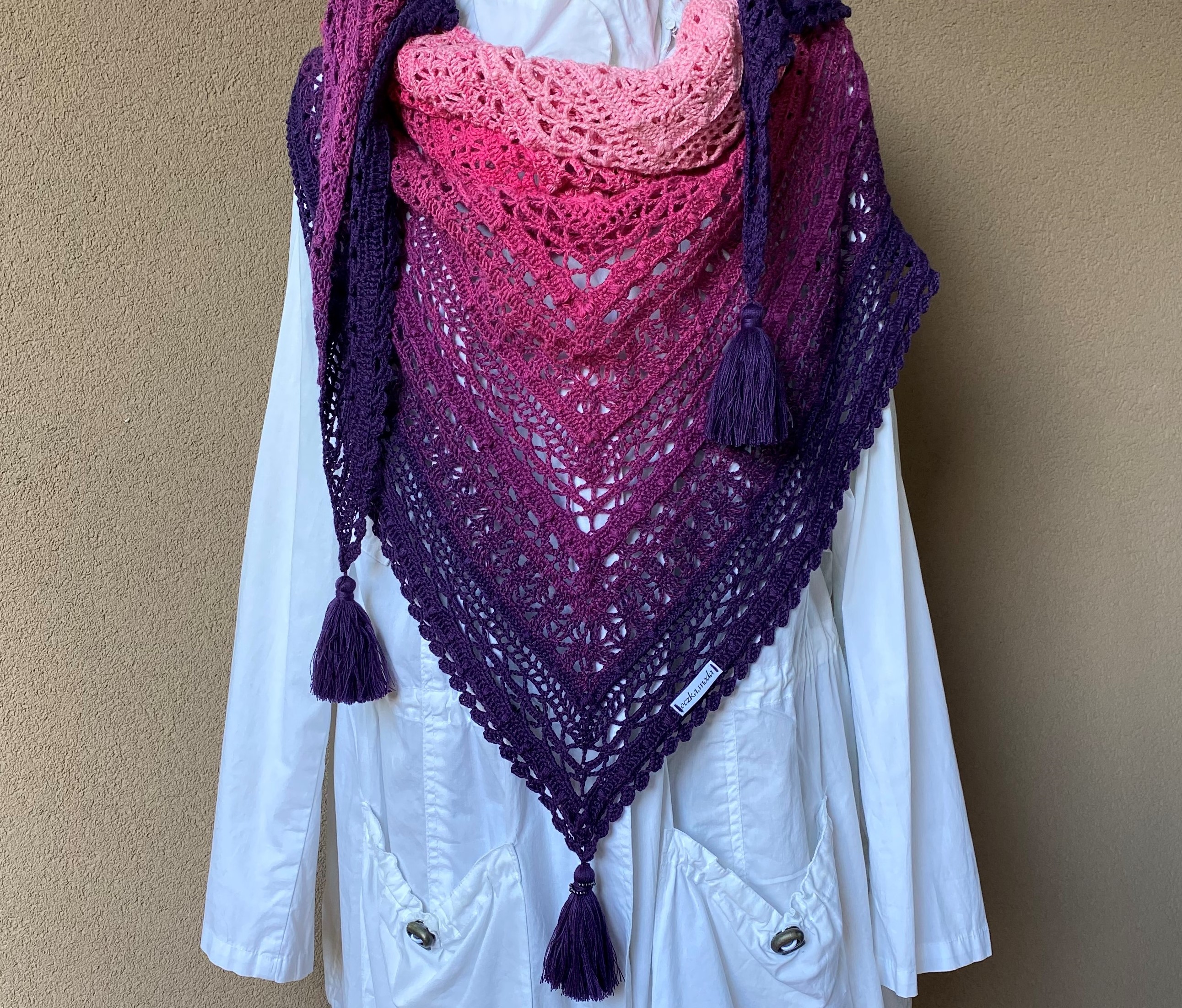 Chusta jest wykonana ręcznie na szydełku z włóczki w odcieniach różu przechodzących w fiolety, zakończona na każdym rogu pięknym chwostem. Chusta jest wyjątkowo duża, wspaniała do otulania się nią, bowiem rozpiętość chusty wynosi blisko 260 cm, a jej szerokość 115 cm. Chusta jest miękka i delikatna z wzorem ażurowym w kształcie figur geometrycznych. Ażurowe prześwity i skład włóczki (50% bawełna i 50% akryl) podpowiadają, że chusta ta będzie wspaniałym dodatkiem do letnich i wczesno-jesiennych kreacji.