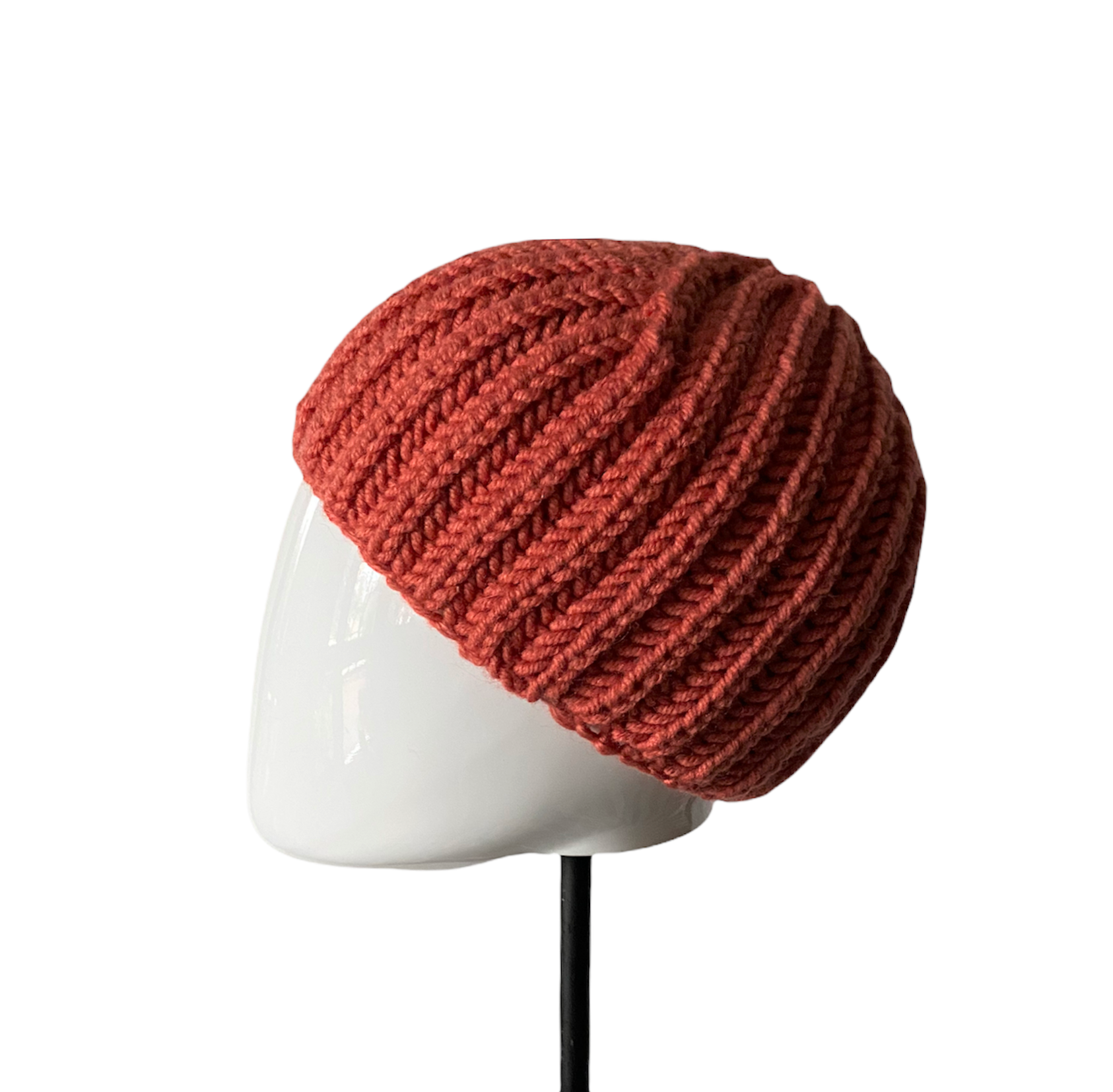 Czapka wykonana na drutach z grubej włóczki: 49% wełna + 51% akryl. Czapka dzięki zastosowaniu dwustronnego wzoru jest gruba, ciepła, mięciutka. Jest krótka, płytka ale dobrze trzyma się na głowie. Rozmiar na obwód głowy 54-57 cm, głęboka na około 19 cm. Kolor koralowy.