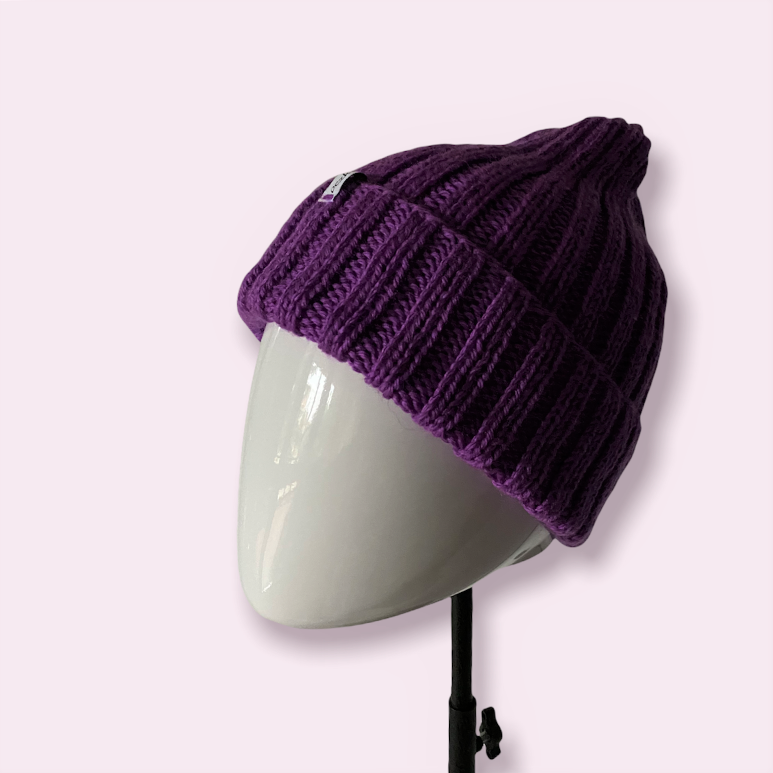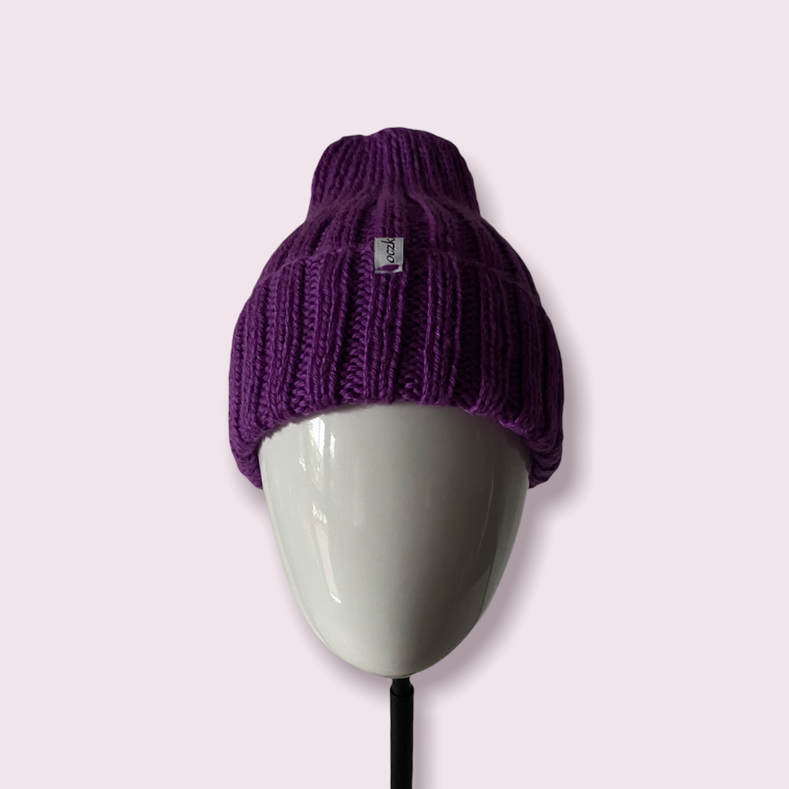 Czapka wykonana na drutach z włóczki: 40% wełna merino, 40% akryl, 20% kaszmir. Skład włóczki i elastyczny wzór nadaje czapce pożądane cechy: jest ciepła (wełna), miękka (akryl), ma gładki wyrazisty splot (kaszmir) i dobrze przylega do głowy, rozmiar ma szeroki zakres 54 cm -58cm obwód głowy, a wysokością wywinięcia bardzo łatwo można regulować wysokość czapki. Wysokość czapki bez zakładania i bez rozciągania wynosi 31 cm. Kolor fioletowy. Rozmiar uniwersalny.