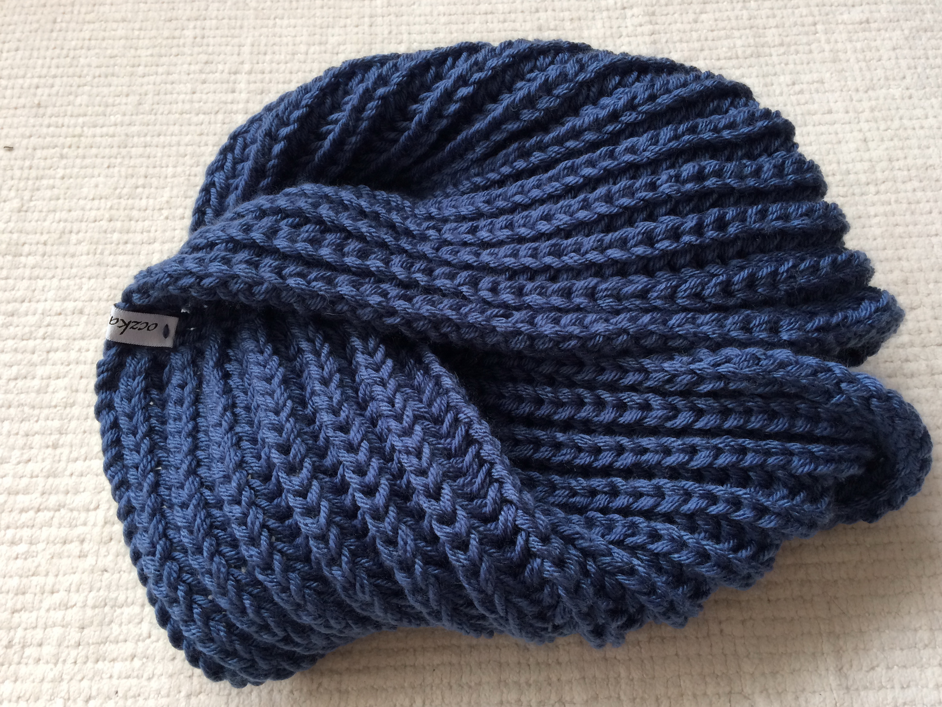 Komin wykonany ręcznie na drutach z mięciutkiej włóczki koloru niebieskiego „ciemny jeans”. Komin jest gruby, rozciągliwy ale elastyczny, dobrze układający się na/pod kurtką lub płaszczem. Rozmiar XXL, szeroki 27 cm, długi 140 cm, zszyty w „ósemkę”, aby się od razu ładnie prezentował. Wykonany podwójną nitką akrylową z właściwością antypilling czyli odporną na mechacenie, włóczka jest delikatna i niegryząca. Prać w temperaturze 30°C i suszyć na płasko.