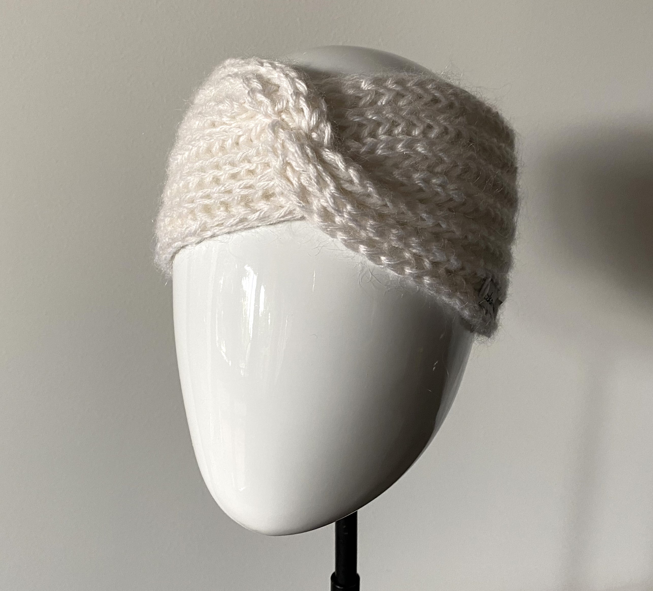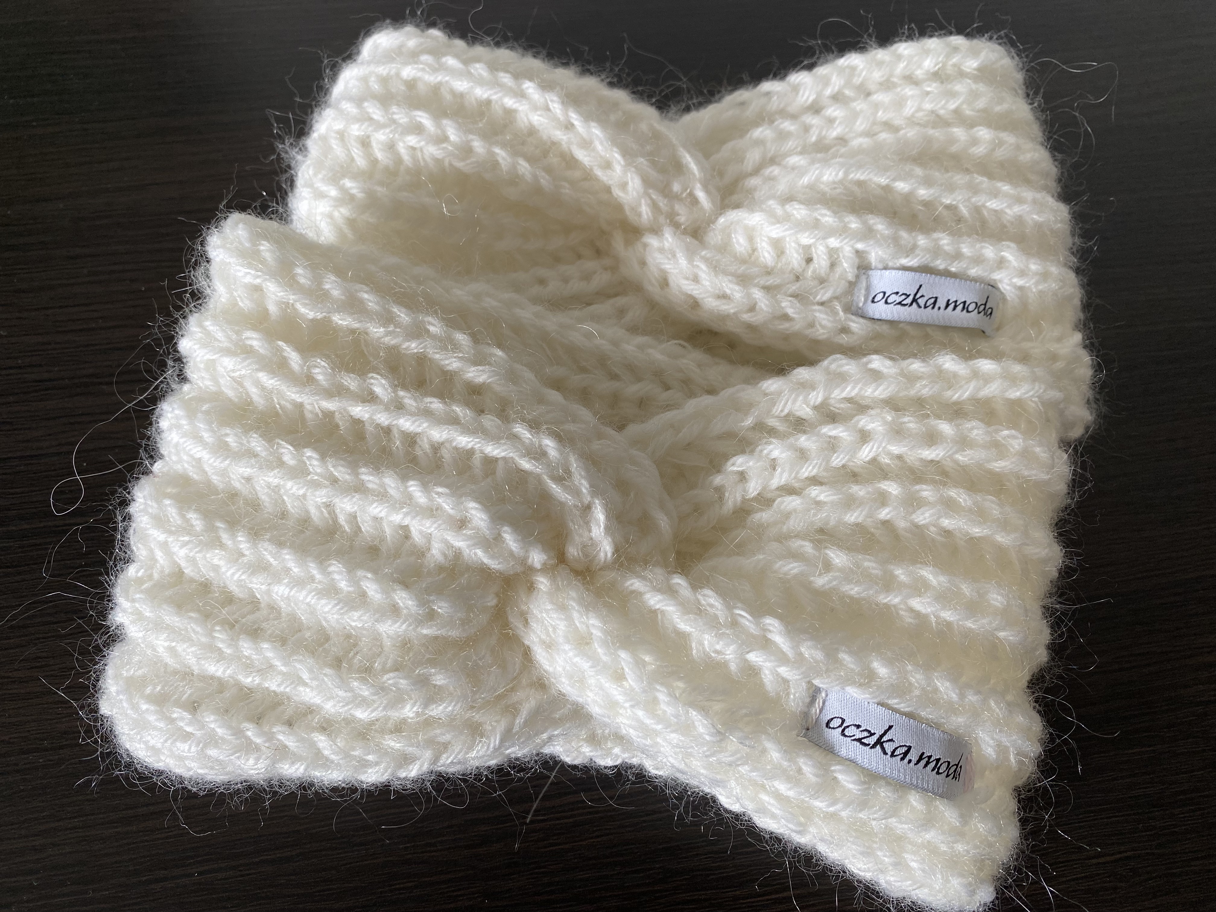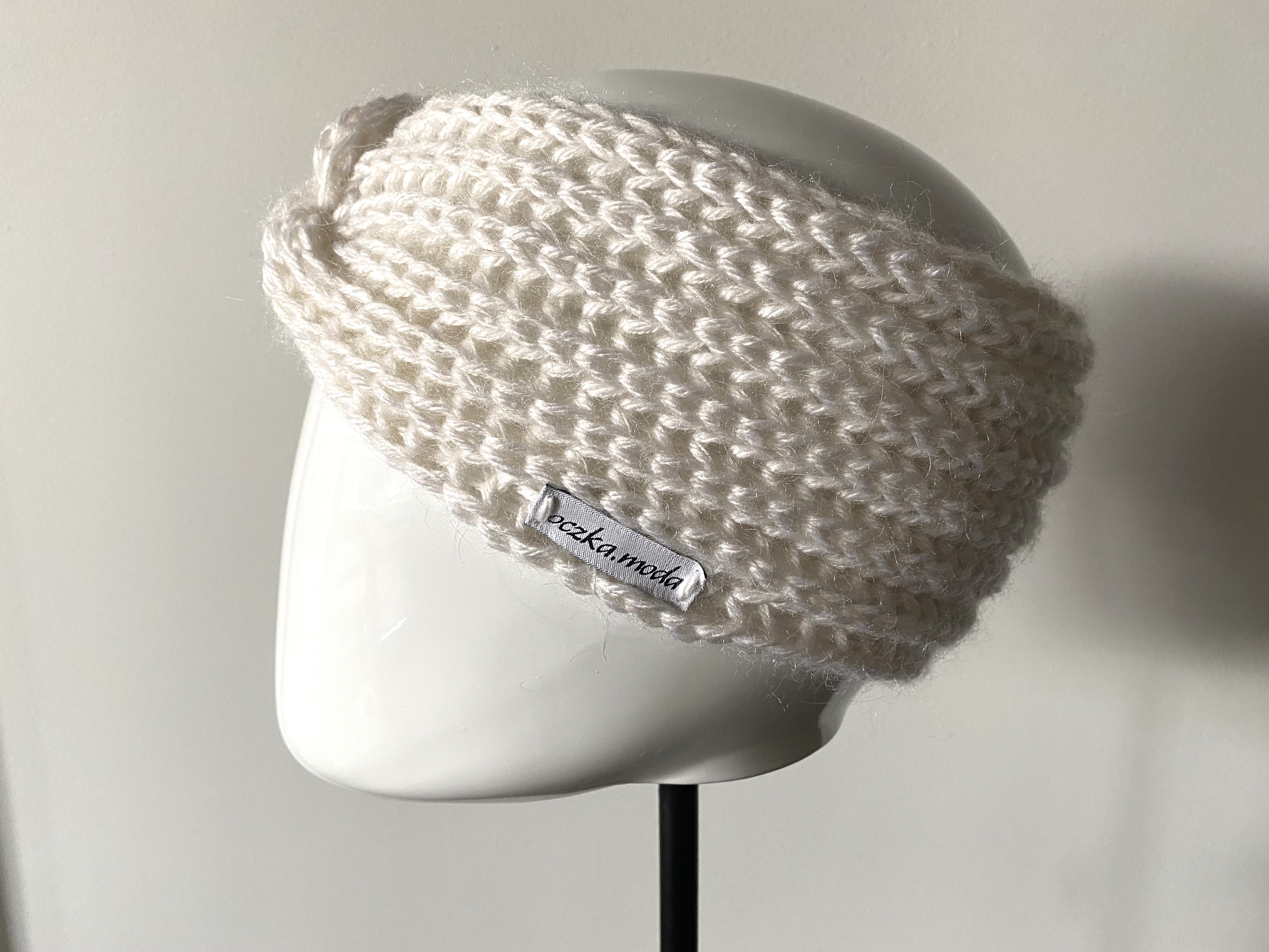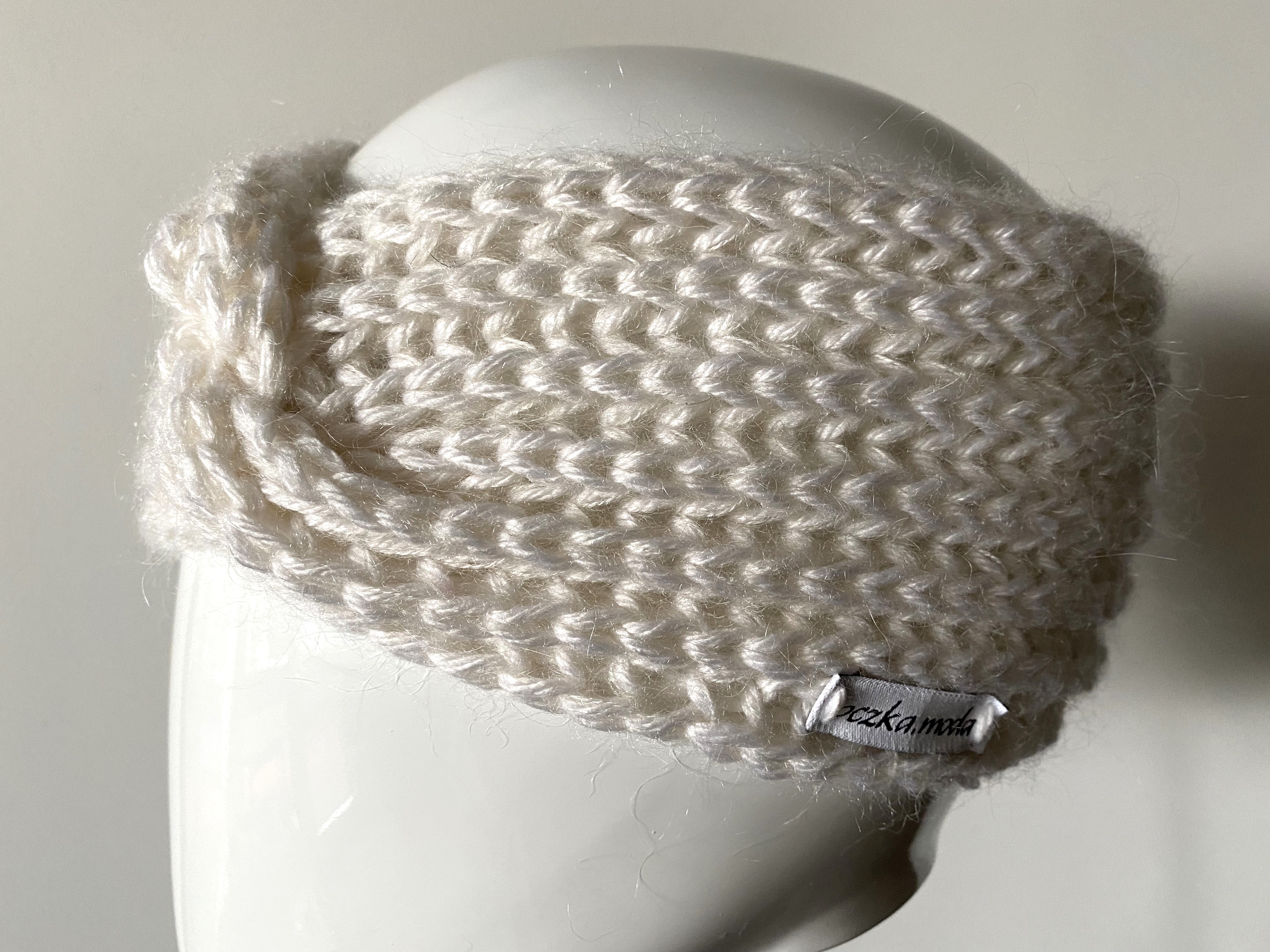 Opaska wykonana jest na drutach z dwóch włóczek: białej 100% wełna oraz białej moherowej. Wykonana wzorem strukturalnym nadającym opasce grubość i miękkość, na przodzie fantazyjne przekręcenie w kokardę. Opaska jest szeroka na około 12 cm, pasuje na obwód głowy od 53- do 58 cm.