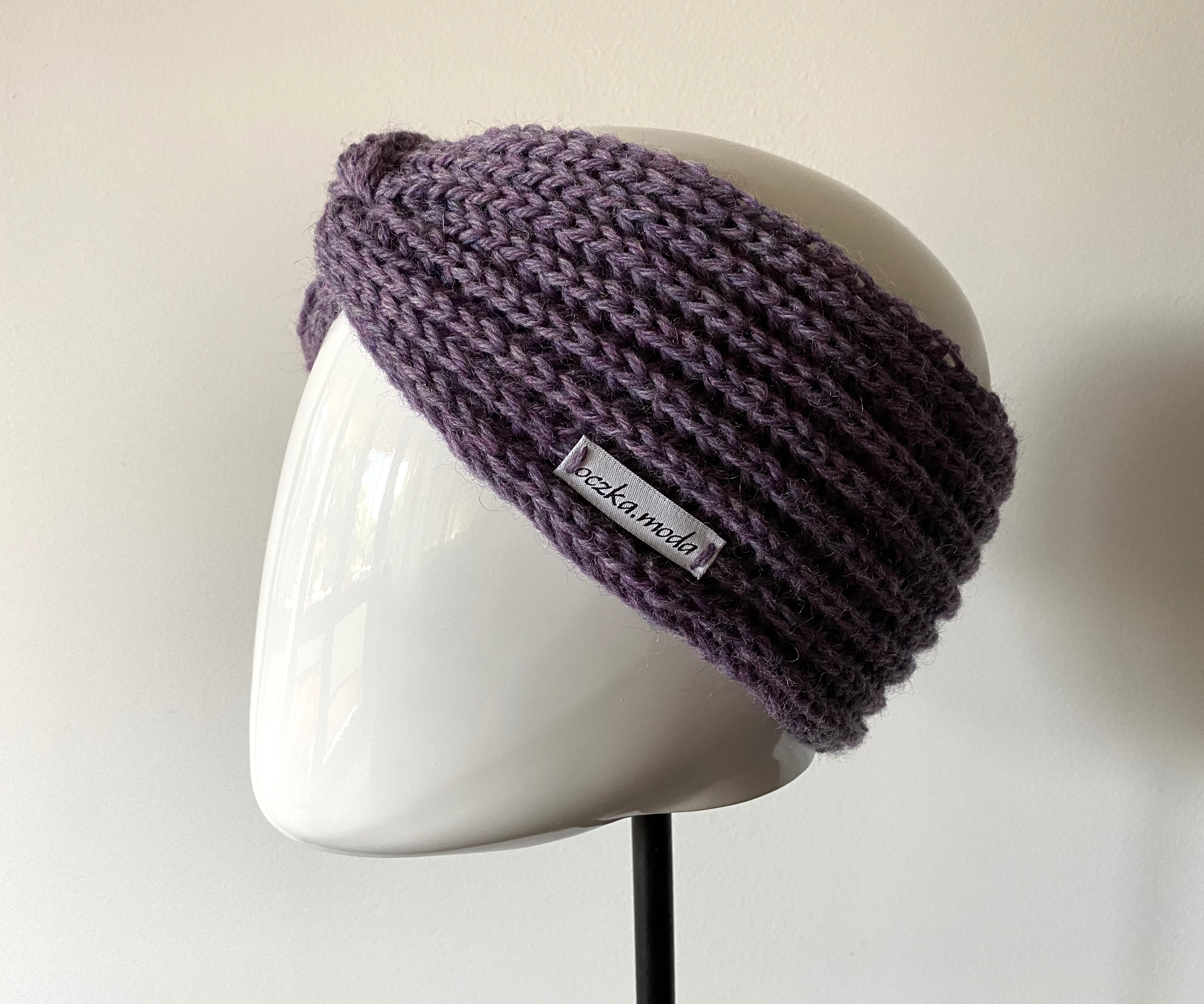 Opaska wykonana jest na drutach z włóczki o składzie: 100% wełna superwash. Wykonana wzorem strukturalnym nadającym opasce grubość i miękkość, na przodzie fantazyjne przekręcenie w kokardę. Opaska jest szeroka na około 10 cm, pasuje na obwód głowy od 53- do 57 cm. Kolor lawendowy.