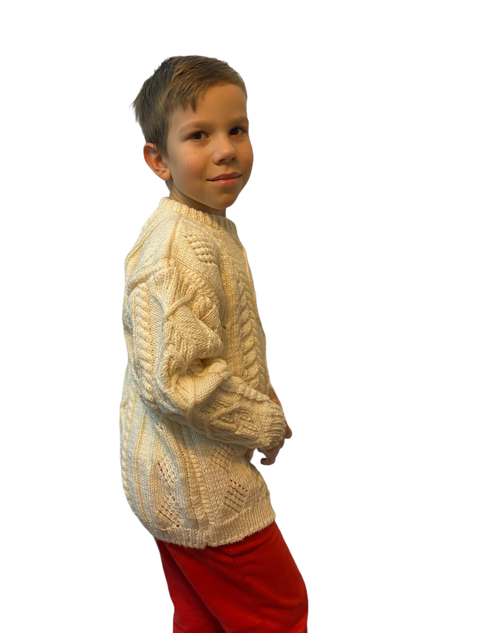 Sweterek na rozmiar 116-122, dla dziecka w wieku około 6-7 lat. Wykonany na drutach z włóczki 100% akryl, miękkiej i przyjemnej w dotyku. Cały sweterek wykonany jest wzorami ażurowymi w romby i listki, połączonymi z warkoczami. Sweter pod szyją ma elastyczny ściągacz, nie jest „ciasny”. Rękawy i dół swetra wykończone ściągaczami. Wymiary swetra przybliżone, mierzone na płasko: obwód 74 cm, całkowita długość 51 cm, długość rękawa od środka pleców 54 cm.
